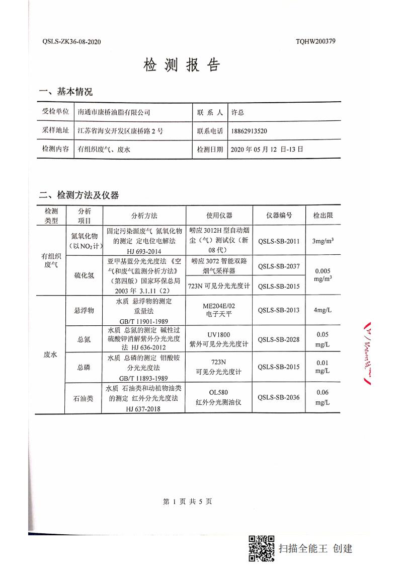 南通市康橋油脂有限公司5月份環(huán)境檢測報告